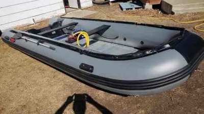 Rated for up to a 45hp engine. Used only a handful of times with a 9.9hp engine. Always stored inside and deflated. Heavy duty skid protection on bottom and sides. Inflatable keel. Aluminum floor with tie downs for fuel tank and battery. 2 bench seats. Includes 12v automatic dual stage air pump, manual foot pump, oars, patch kit (never used), spare air valve and wrench and carry/storage bags.